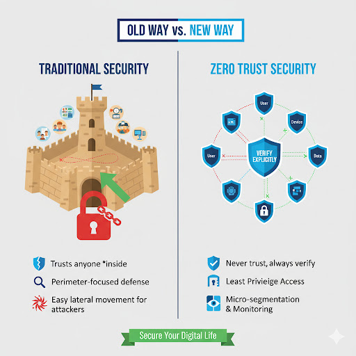 Zero Trust completely destroys the old model. It assumes that the "dorm" is already compromised. It assumes a stranger might already be inside.